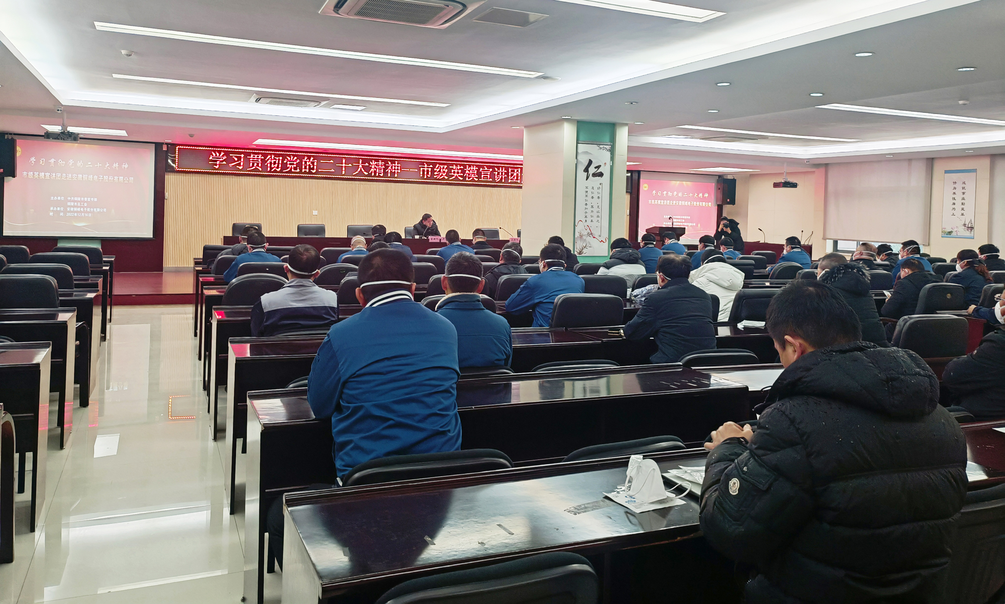 為深入學(xué)習(xí)宣傳貫徹黨的二十大精神,大力弘揚(yáng)勞模精神、勞動(dòng)精神、工匠精神,推動(dòng)黨的創(chuàng)新理論深入人心、落地生根,12月16日下午,由市委宣傳部、市總工會(huì)主辦、公司承辦的“學(xué)習(xí)貫徹黨的二十大精神--市級(jí)英模宣講團(tuán)走進(jìn)銅峰電子”宣講報(bào)告會(huì)在公司辦公樓二樓職教室舉行。會(huì)上邀請(qǐng)全國五一勞動(dòng)獎(jiǎng)?wù)芦@得者、銅陵金隆銅業(yè)公司技術(shù)主管盧鵬勞模作黨的二十大精神專題宣講。公司黨委書記、董事長(zhǎng)黃明強(qiáng)等公司黨政領(lǐng)導(dǎo)班子成員參加宣講報(bào)告會(huì),公司各黨支部書記、分工會(huì)主席和先進(jìn)模范、新黨員、入黨積極分子、群眾代表等聆聽了報(bào)告。宣講報(bào)告會(huì)由公司黨委副書記潘世宇主持。