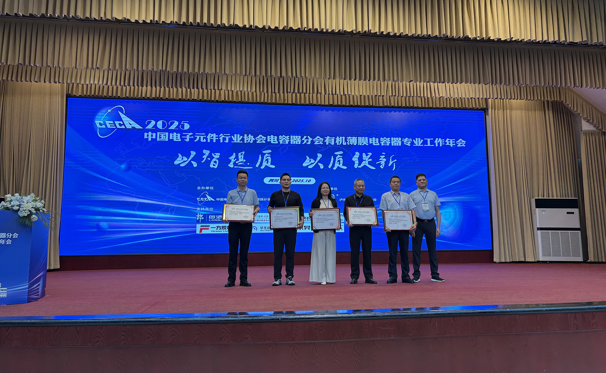 10月14日至17日,中國電子元件行業(yè)協(xié)會電容器分會有機專業(yè)2025年工作年會在四川瀘州成功舉辦。中電元協(xié)常務理事、電容器分會第九屆副理事長、公司總經理鮑俊華代表公司出席并作主題交流報告。薄膜分公司獲評電容器分會2025年度“優(yōu)秀供應商”榮譽稱號。
